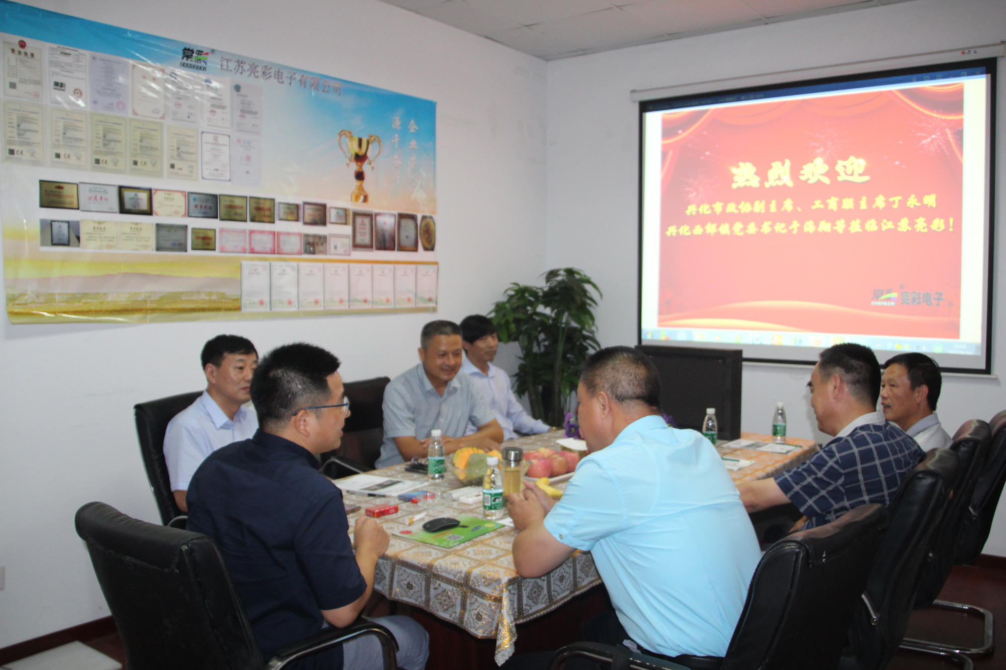 8 ,16 afternoon, cool autumn wind, by the Xinghua municipal CPPCC Vice Chairman, Federation Chairman Ding Yongming, the western suburbs of Xinghua town Party Secretary Yu Haixiang and other leaders to visit the Jiangsu Liangcai electronic limited company to visit the exchange, warmly welcomed by the general manager Mr. Zhang Jiuyu.