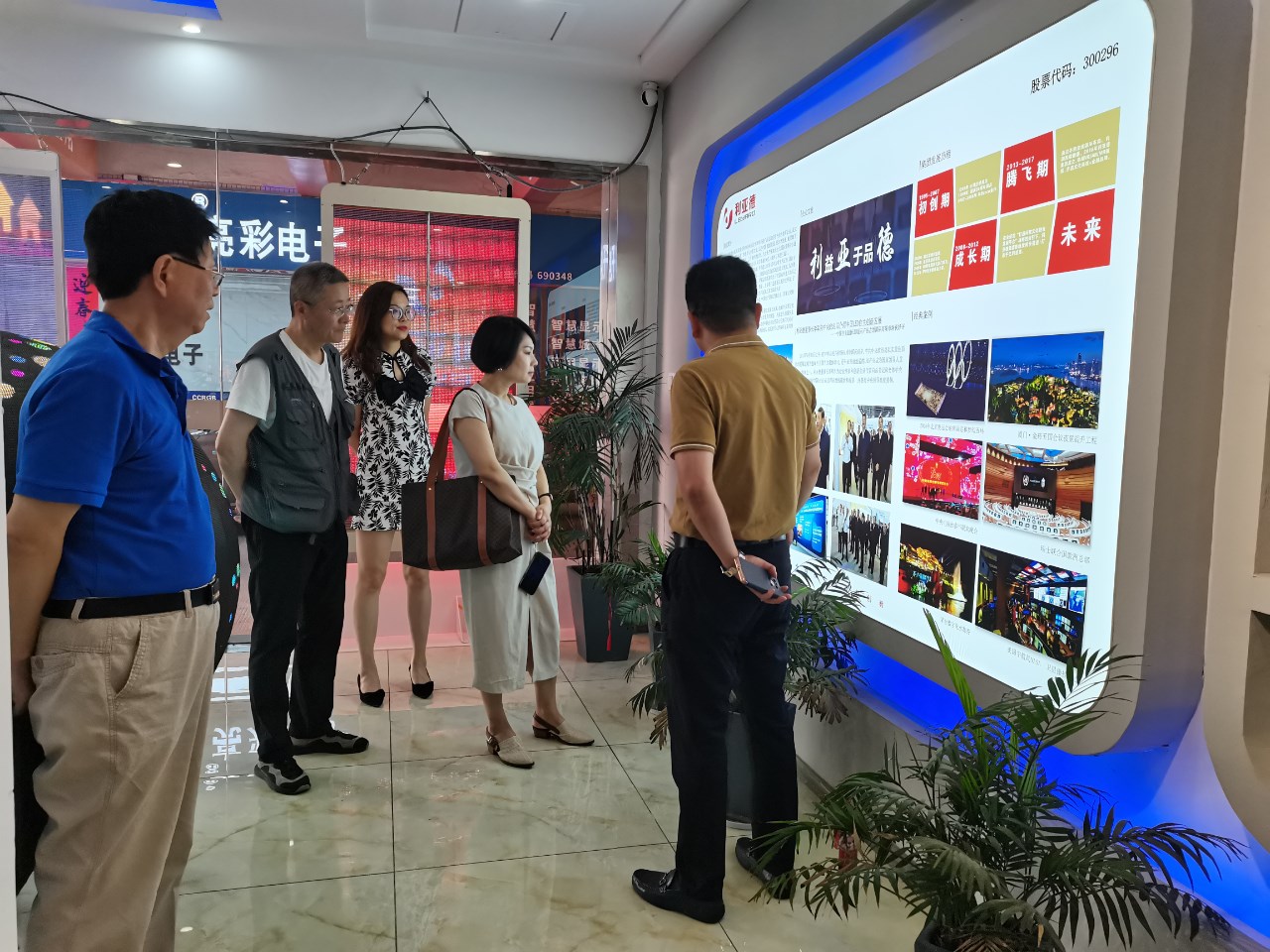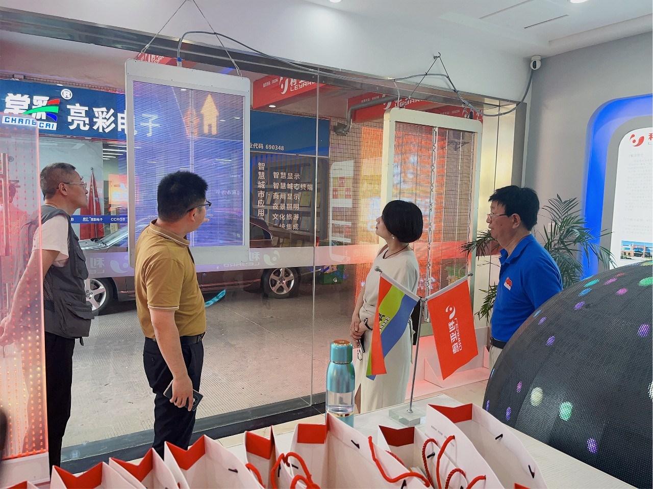 步入展廳,章總向各位領導介紹了LED顯示特色產品,如135寸會議一體機、球形屏、地磚互動屏、3D屏等,包含多類不同的應用場景。