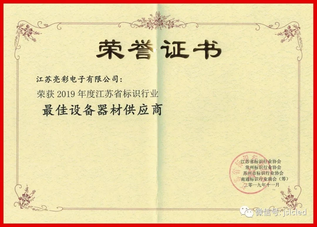 在這次盛會上,榮獲"2019年度江蘇省標識行業最佳設備供應商"。這是江蘇亮彩公司的光榮,感謝協會對我司的認可,以此為今后工作更大的動力,更好地為協會和廣大客戶服務!